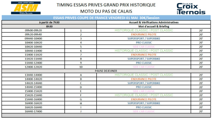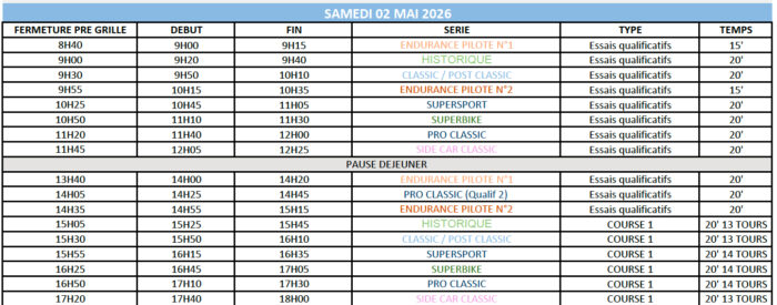 Samedi 2 mai, les essais chronométrés débuteront à 8h40 alors que les premières courses auront lieu à partir de 15h05, avec dans l’ordre les championnats Historique, puis Classic/Post-Classic, Supersport et Superbike. Cette journée se conclura avec un pot de l’amitié prévu à 18h30.