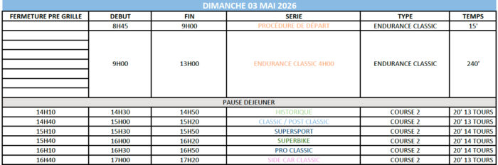 Dimanche 3 mai ouvrira avec la course d’Endurance de 4 heures, programmée de 9h à 13h. Puis débuteront les courses 2 des championnats Vitesse à partir de 14h10, dans le même ordre que la veille.